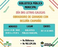 Con motivo das celebracións do Día das Letras Galegas, a Biblioteca Pública Municipal de Barreiros acollerá o xoves 14 de maio, en horario de 18:00 a 19:30 horas, a actividade titulada Obradoiro de gravado con Begoña Caamaño, unha proposta organizada polo Concello de Barreiros e incluída no programa Ler conta moito.