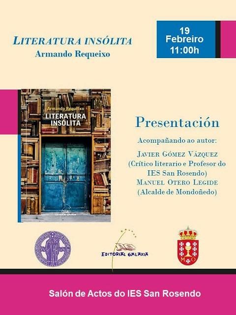O escritor Armando Requeixo presentará o seu libro titulado Literatura insólita este xoves, día 19 de febreiro, en Mondoñedo. Será ás 11:00 horas no salón de actos do IES San Rosendo.