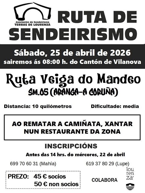 A Asociación de Sendeirismo Terras de Lourenzá organiza para o día 25 de abril, sábado, un percorrido pola ruta Veiga do Mandeo, no municipio coruñés de Aranga. A distancia a percorrer son 1o quilómetros e a dificultade é media. Ao rematar a camiñada os participantes xantarán nun restaurante.