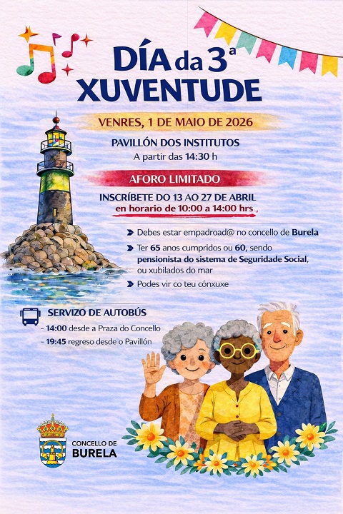 O Concello de Burela anuncia que abrirá o luns 13 de abril o prazo de inscrición para participar no Día da 3ª Xuventude, “unha das citas máis especiais do calendario social do municipio, dirixida a recoñecer e celebrar o papel das persoas maiores na construción da vila”. A xornada terá lugar o venres 1 de maio no pavillón dos Institutos a partir das 14:30 horas, cun programa “pensado para fomentar a convivencia, o reencontro e o goce colectivo”. O evento contará con prazas limitadas, polo que será necesario formalizar previamente a inscrición.