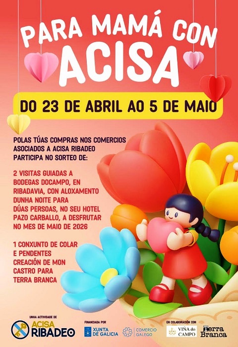 Para Mamá con ACISA é a campaña que a Asociación de Comerciantes, Industriais, Servizos e Autónomos de Ribadeo está a desenvolver ata o 5 de maio. Acisa sorteará tres premios: dúas visitas guiadas a Bodegas Docampo, en Ribadavia, para dúas persoas con aloxamento dunha noite no seu Hotel Pazo Carballo, e un conxunto de colar e pendentes, creación de Mon Castro para Terra Branca.