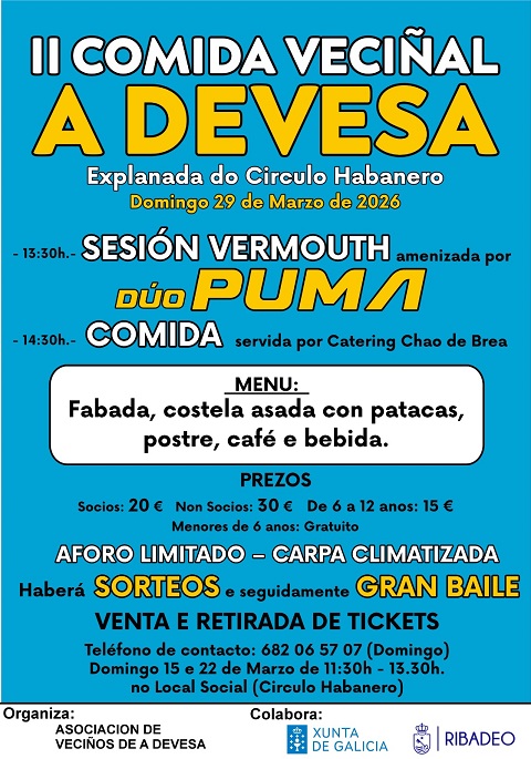 A Asociación de Veciños Santa Eulalia da parroquia ribadense de A Devesa organiza a súa segunda comida veciñal para o día 29 de marzo, domingo. Será na explanada do Círculo Habanero.