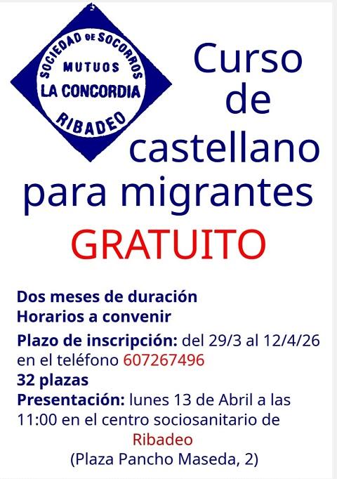 El colectivo Sociedad de Socorros Mutuos La Concordia, de Ribadeo, organiza un curso de castellano para migrantes gratuito que comenzará el día 13 de abril. Tendrá una duración de dos meses y hay 32 plazas.