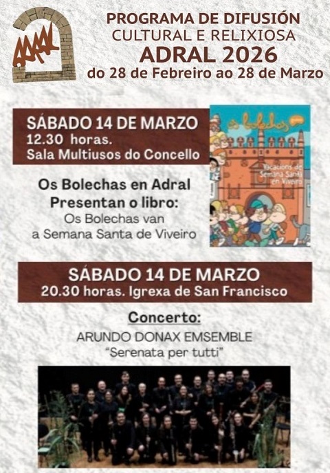 Dentro do programa de difusión cultural e relixiosa Adral, este sábado, día 14 de marzo, en Viveiro presentarase o novo libro titulado Os Bolechas van á Semana Santa de Viveiro e haberá un concerto do grupo lugués de vento madeira Arundo Donax Ensemble.