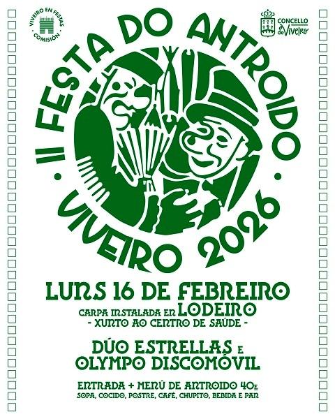 Este evento está organizado polo colectivo Viveiro en Festas, que anuncia: “a cea (menú de cocido) ten un prezo de 40 euros e o baile correrá a cargo do dúo Estrellas e Discomóvil Olympo. Moito ollo, que este ano hai previa desde as 20:30 horas. Tamén haberá concurso de disfraces, sorteos e algunha sorpresa máis, así que xa podes ir dándolle á cabeciña. Se o cocido non é o teu, non pasa nada, podes ir só á festa. Desde as 0:00 horas podes gozar do Antroido por 6 euros (incluída consumición). Para facer a reserva de mesas e conseguir as entradas podes completar o formulario da seguinte ligazón: https://forms.gle/xF4q4J7qntWSsWxs7 ou escribirnos ao whatsapp (614 191 962), ata o 8 de febreiro”.