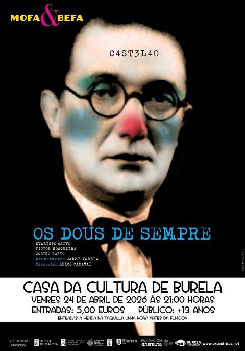 O día 24 de abril, venres, a obra teatral Os dous de sempre chega a Burela da man de Mofa e Befa, “un dos dúos máis recoñecidos do teatro galego. Unha proposta escénica que trae ao escenario a dous personaxes ben coñecidos. Se che gusta rir, e ao mesmo tempo darlle unhas voltas á cabeza, este é o teu plan”, anuncia o Concello de Burela.