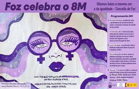A delegación de Muller e Igualdade do Concello de Foz conmemora o día 8 de marzo, Día Internacional das Mulleres, co lema Agora máis coeducación ca nunca, “apostando por unha convivencia en igualdade de todas as nenas e nenos, independentemente da súa identidade de sexo ou de xénero. Sendo necesario eliminar estereotipos ou calquera mecanismo discriminatorio nos centros educativos, para garantir un desenvolvemento integral e igualitario, fomentando a educación no sexista, o respecto e a prevención da violencia. A pretensión con esta transformación social é crear un cambio social, derivando nunha sociedade máis xusta e pacífica. É un día para a denuncia e a reivindicación por todo o que queda por facer, pero tamén para celebrar os avances acadados”, anuncia a concelleira de Muller e Igualdade, Ana Rojo, que engade: “unha maneira de visibilizar esta coeducación é o cartel que eliximos para presentar as actividades deste 8M no Concello de Foz: unha ilustración dun traballo de dúas alumnas do Colexio Martínez Otero de Foz (L.P.A. e L.M.R.), Unha vez que pos as lentes violetas non hai marcha atrás. Con este traballo defenden que por moito que estea arraigado o sexismo néganse a dar marcha atrás con determinación, para seguir na loita polos dereitos das mulleres baixo a mesma cor: a da igualdade!”