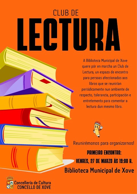 O Departamento de Cultura do Concello de Xove pon en marcha unha nova iniciativa cultural dirixida ás persoas afeccionadas á lectura: a creación dun Club de Lectura na Biblioteca Municipal de Xove. “Este proxecto nace co obxectivo de crear un espazo de encontro para todas aquelas persoas que disfrutan dos libros e que desexan compartir a experiencia da lectura con outras persoas. Con este propósito a Biblioteca Municipal organiza un primeiro encontro informativo e de toma de contacto para iniciar a posta en marcha do club. A reunión para todas as persoas interesadas terá lugar o venres 27 de marzo ás 19:00 horas nas instalacións da biblioteca”, anuncia o Concello de Xove, que engade: “este encontro servirá para explicar o funcionamento do club, recoller propostas das persoas asistentes e establecer conxuntamente as directrices desta nova actividade cultural, coa intención de que resulte atractiva e enriquecedora para todas as persoas participantes. Dende o Concello de Xove anímase a todas as persoas amantes da lectura e usuarias da biblioteca a achegarse a esta primeira reunión e a formar parte deste novo espazo de encontro cultural, no que compartir e disfrutar xuntos da boa lectura”.