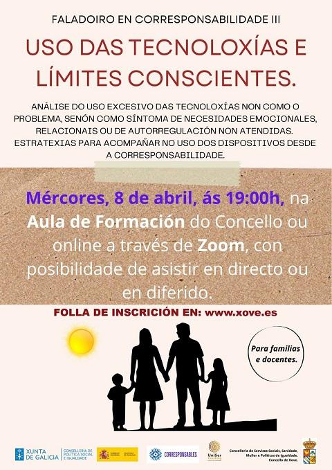 O Concello de Xove explica que é un faladoiro en corresponsabilidade sobre o uso das tecnoloxías e límites conscientes no que se analizará o uso excesivo das tecnoloxías “non como o problema senón como síntoma de necesidades emocionais, relacionais ou de autorregulación non atendidas e estratexias para acompañar no uso dos dispositivos desde a corresponsabilidade”. Ademais anuncia: “pechamos o ciclo de Faladoiros en Corresponsabilidade! Tras o éxito das dúas sesións anteriores, chega a última cita deste ciclo tan enriquecedor. O vindeiro mércores 8 de abril celebraremos a terceira charla, na que seguiremos aprendendo ferramentas prácticas para mellorar as dinámicas familiares e educativas. Falaremos de corresponsabilidade, diálogo e traballo en equipo, creando un espazo aberto para compartir experiencias, resolver dúbidas e medrar xuntos/as. Non perdas esta oportunidade de seguir construíndo en comunidade!”.