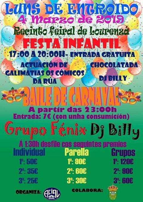 O luns de Entroido, 4 de marzo, celebrarase unha festa infantil no recinto feiral de Lourenzá. Será desde as 17:00 ata as 20:00 horas con entrada gratuíta. Haberá actuacións de Galimatías Os cómicos da rúa, chocolatada e actuación do Dj Billy.