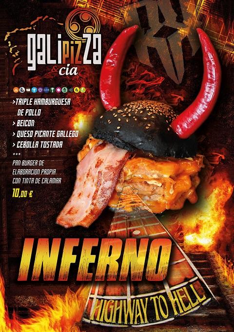 La marca vivariense Galipizza no quiso dejar de celebrar a su manera el Resurrection Fest y, aprovechando las fechas en las que se iba a celebrar este multitudiario festival en Viveiro (Lugo), lanza su nueva hamburguesa gourmet bajo el nombre de 'Inferno' con la que rinde homenaje al festival y a los miles de seguidores que cada año abarrotan las calles de Viveiro.