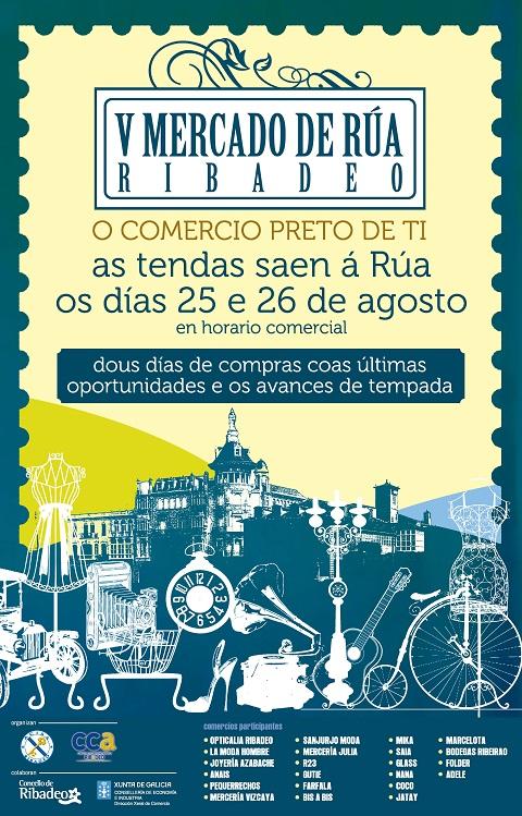 Os 22 comercios participantes no V Mercado de Rúa son: Opticalia Ribadeo, La Moda Hombre, Joyería Azabache, Anais, Pequerrechos, Mercería Vizcaya, Sanjurjo Moda, Mercería Julia, R23, Gutié, Farfala, Bis a Bis, Mika, Saia, Glass, Naná, Coco, Jatay, Maercelota, Bodegas Ribeirao, Folder e Adele.