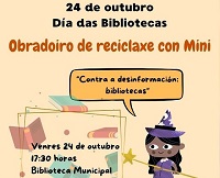 Con motivo da celebración do Día das Bibliotecas, este venres, día 24 de outubro, ás 17:30 horas a Biblioteca Municipal de Ribadeo acollerá o Obradoiro de reciclaxe con Mini, baixo o lema Contra a desinformación: bibliotecas.