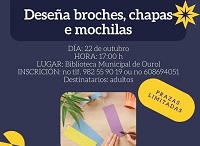 O Concello de Ourol organiza un obradoiro de manualidades para deseñar broches, chapas ou mochilas. Será na biblioteca municipal o día 22 de outubro, mércores, ás 17:00 horas.
