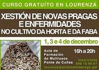 O Sindicato Labrego Galego organiza un curso gratuíto sobre xestión de novas pragas e enfermidades no cultivo da horta e da faba. Será en Lourenzá, concretamente na Aula de Formación do Multiusos Ponte de Cuñas, os días 1, 3 e 4 de decembro de 16 a 20 horas.