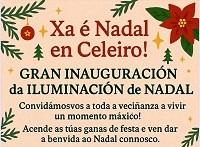 A Asociación de Veciños Celeiro de Mariñaos anuncia: “xa é Nadal en Celeiro. Gran inauguración da iluminación de Nadal. Convidámosvos a toda a veciñanza a vivir un momento máxico! Acende as túas ganas de festa e ven dar a benvida ao Nadal connosco. O vindeiro sábado, 13 de decembro, ás 7 da tarde nas Escolas de Celeiro. Haberá chocolatada para todos, un doce agasallo para quentar o corpo e o corazón mentres as luces comezan a brillar”.