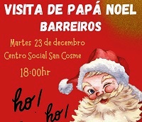 O Concello de Barreiros anuncia que “Papá Noel chama á porta e quere falar coas nenas e nenos de Barreiros. Cóntanos que estará o martes 23 de decembro no centro sociocultural de San Cosme a partir das seis da tarde. Seica vén con moitas ganas de saudar á cativada e ás súas familias, así que animámosvos a achegarvos a este encontro tan especial e agardado do Nadal”.