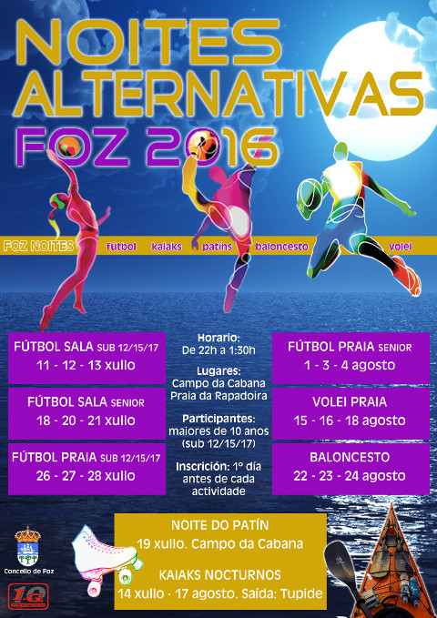 As Noites Alternativas no Concello de Foz están dirixidas a rapaces e rapazas maiores de 10 anos, sub 12, 15 e 17 e as actividades desenvolveranse entre as dez de noite e a unha e media de madrugada. Terán lugar no Campo da Cabana e na praia da Rapadoira.