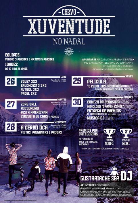 O Concello de Cervo pon en marcha o programa Xuventude no Nadal, que inclúe actividades do 26 ao 30 deste mes. Foi presentado no Instituto de Secundaria Marqués de Sargadelos, de San Ciprián pola concelleira de Cultura e Xuventude, Dolores García Caramés, e o de Deportes, José Ramón Soto Martínez.