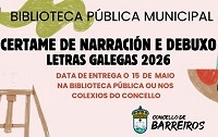 O Concello de Barreiros convoca o Certame de Narración e Debuxo Letras Galegas 2026, ao que se poden presentar traballos ata o día 15 de maio, venres.