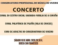 Este sábado, día 18 de abril, a Igrexa de San Francisco, de Viveiro acollerá “unha cita musical imprescindible coa participación de tres agrupacións corais. Unha tarde para gozar do talento e da polifonía en directo a partir das 20:30 horas”, anuncia o Concello de Viveiro. Actuarán a Coral do Centro Social Sagrada Familia (A Coruña), a Coral Polifónica de Piloño (Vila de Cruces) e o Coro de Adultos do Conservatorio de Viveiro.
