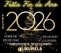 Está organizada polo Concello de Burela, que anuncia: “na noite de fin de ano despediremos o 2025 ao grande. De 00:30 a 05:30 bailaremos con Conxuro Discomóvil, que traerá os mellores éxitos de onte e de hoxe que recibamos o 2026 con festa e moita música. Ven á carpa da praza da Mariña para vivir un comezo de ano inesquecible en Burela!”.