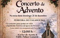 Nesta actividade colabora a asociación cultural Ao compás do río Ouro, que anuncia: “un concerto de Advento para poñer en valor o harmonio histórico da igrexa de Ferreira de O Valadouro. Grazas a Pablo Peláez e Xavier de Acosta, este harmonio foi recuperado. Este domingo 21 poderedes disfrutar dun concerto diferente”.