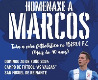 O Iberia Club de Fútbol homenaxeará ao futbolista Marcos, que se retira despois de xogar durante máis de 40 anos nese equipo. Será cun evento que se celebrará o día 30 de xuño, domingo, no Campo das Valgas, de San Miguel de Reinante, desde as 12:00 horas. Haberá partido de fútbol entre o Iberia FC e un combinado de ex xogadores do club e despois, ás 14:30 horas, xantar homenaxe.