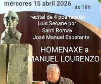 A organización do evento anuncia que “consistirá nun recitado de catro poemas de Luís Seoane seleccionados por Manuel Lourenzo para ser recitados por el mesmo; así falarámolo o 24 de xaneiro de 2025, día do nacemento de Maruja Seoane. Neste 15 de abril serán os actores Santi Romay e Xosé Manuel Esperante os que lles poñan voz aos poemas e agardamos una pequena sorpresa. Con este motivo publicarase un pequeno libro cos catro poemas de Luís Seoane e recollidos coa letra autógrafa de Manuel Lourenzo. Tamén no mesmo día farase público o Premio de Teatro Manuel...