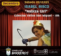A actriz Isabel Risco representará a comedia Nabiza Girl no municipio de Barreiros, concretamente nos Colexios Vellos de San Miguel, este sábado, día 20 de decembro, ás 19:00 horas. A entrada é de balde.