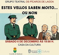 O grupo teatral Os pícaros de Lagoa representará a obra Estes vellos saben moito… ou non no Valadouro este sábado, día 6 de decembro. Será na Casa da Cultura ás 19:00 horas, dentro do Circuíto de Teatro Afeccionado organizado pola Área de Cultura da Vicepresidencia da Deputación de Lugo.