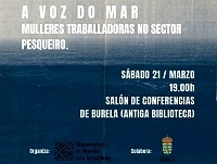 O Observatorio da Mariña pola Igualdade (OMI) organiza a xornada titulada A voz do mar: mulleres traballadoras no sector pesqueiro. Será este sábado, día 21 de marzo, ás 19:00 horas no Salón de Conferencias de Burela. Interveñen no evento Sandra Amezaga (coordinadora xeral de Mulleres Salgadas); Susana Riveira (ex traballadora do sector da conserva); Begoña Pernas, (presidenta da cooperativa de estibadoras O Cantiño); e a Presidenta da Asociación de Redeiras de Burela, María del Mar Febrero.