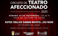“Este sábado pechamos o mes de teatro cunha nova proposta do Circuito de Teatro Afeccionado 2025: Estes vellos saben moito … ou non, de Os Pícaros de Lagoa. É unha comedia costumista para todos os públicos cunha duración de 60 minutos e entrada de balde”, explica o Concello de Alfoz, que tamén anuncia que “antes da obra, ás 19:00 horas, terá lugar a presentación do libro As tolas que non o eran, de Carmen V. Valiña, actividade incluída na programación do 25N”.