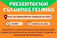 leer másO Concello de Xove convoca a todas as persoas que habitualmente alimentan gatos na rúa en Xove Pobo e Palmeiro a unha reunión informativa, coa finalidade de dar a coñecer a nova ordenanza municipal en materia de xestión de colonias felinas. Será este venres, día 10 de abril, ás 20:00 horas na Aula de Formación do Concello de Xove.