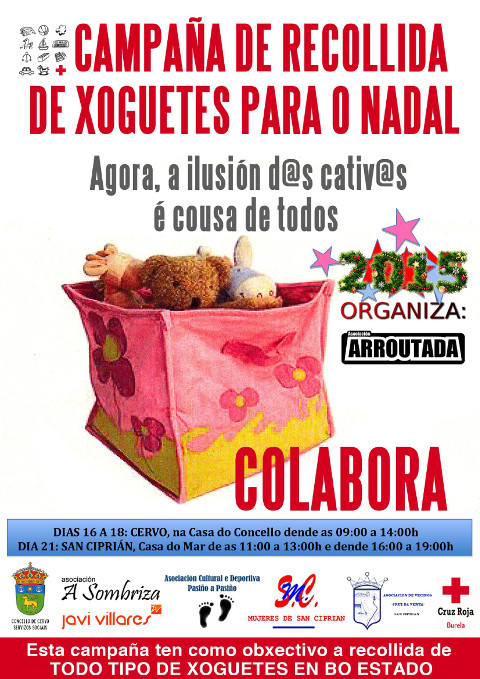 La Asociación Cultural Arroutados realiza un año más su campaña de recogida de juguetes, que irá destinada a Cruz Roja de Burela. Una vez más, tanto el Ayuntamiento como diversas asociaciones del municipio cervense, como Mulleres de San Ciprián, A Sombriza, Pasiño a Pasiño y Vecinos Cruz da Venta colaboran en esta actividad que tanto éxito ha tenido estos últimos años. Su presidente, Marcos González Villares explica que “esta iniciativa lleva a los hogares de los más necesitados la ilusión que tan necesaria es en la época navideña". Por ello todos aquellos que quieran acercar sus juguetes ya usados y que no utilicen deben dirigirse al Ayuntamiento de Cervo hasta este viernes a las 14 horas o el lunes 21 a la Casa de Mar de San Ciprián de 11 a 13 horas y se 16 a 19 horas.