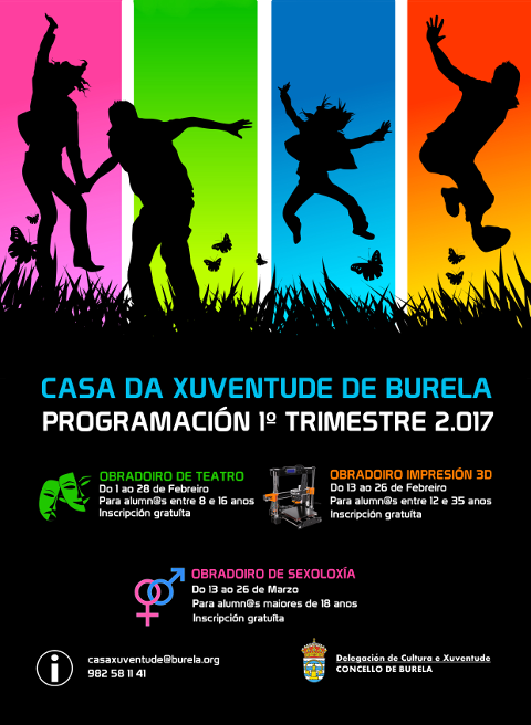 A Delegación de Xuventude presentou hoxe as actividades programadas para este primeiro trimestre do ano nas que figuran tres obradoiros: teatro, impresión en 3D e sexoloxía. A inscrición nestas actividades, dirixidas a nen@s e xóvenes, é gratuíta.