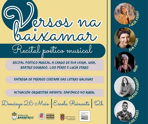 Este domingo, 26 de maio, ás 12:00 horas celebrarase en Barreiros a cuarta edición do recital poético-musical "Versos na a Baixamar". Terá lugar no exterior das escolas de Reinante e, en caso de mal tempo, trasladarase aos colexios vellos de San Miguel.