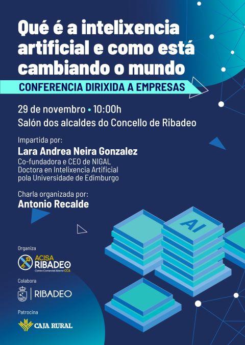 Acisa Ribadeo en colaboración con el empresario Antonio Recalde, organiza el próximo 29 de noviembre a las 10:00 horas en el Salón de los Alcaldes del Concello de Ribadeo una conferencia titulada Qué é a intelixencia artificial e como está cambiando o mundo, un evento especialmente orientado a empresas, autónomos y profesionales que buscan comprender y aprovechar las nuevas oportunidades que ofrece la inteligencia artificial (IA). La sesión cuenta con la colaboración del Concello de Ribadeo y el patrocinio de Caja Rural.