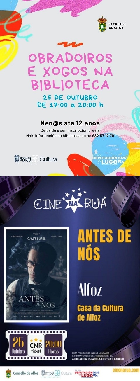 Ademais ás 20:00 horas na Casa da Cultura terá lugar a proxección da película Antes de nós, unha iniciativa da área de Cultura do Concello de Alfoz dentro da programación para celebrar o Día das Bibliotecas. “Unha sesión de cinema con entrada libre que inclúe mensaxes informativos e de sensibilización da Asociación Española contra o Cancro. Non perdas esta oportunidade de desfrutar do mellor cine en Alfoz”, anuncia o Concello.