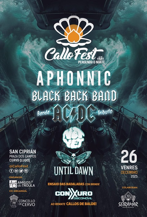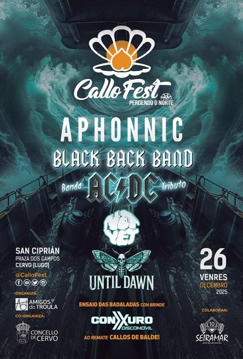 O Concello de Cervo, en colaboración coa Asociación Amigos da Troula, vén de anunciar o cartel oficial da sétima edición do Callo Fest, que se celebrará o venres 26 de decembro na Praza dos Campos de San Ciprián. Esta nova edición “está pensada como unha auténtica festa de pre-fin de ano, para gozar con amigos e en familia nun ambiente festivo, próximo e aberto a todas as idades. Tal e como apuntan desde a organización, o line-up deste ano reúne catro propostas moi potentes e variadas, capaces de satisfacer a un público diverso”, que son Aphonnic, Black Back Band, Not Yet e Until Cawn.