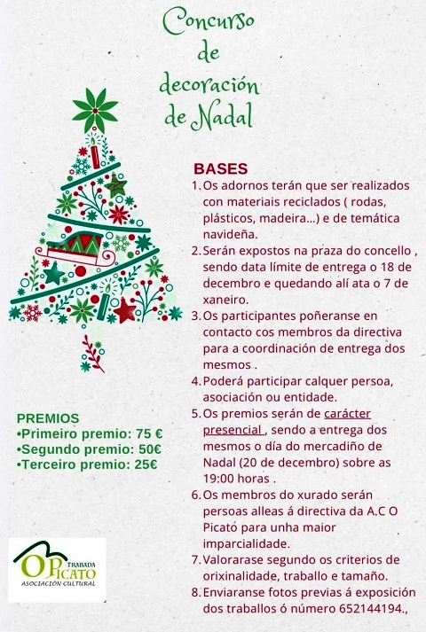 As bases do certame son as seguintes: “os adornos terán que ser realizados con materiais reciclados (rodas, plásticos, madeira...) e de temática navideña; serán expostos na Praza do Concello, sendo data límite de entrega o 18 de decembro e quedando alí ata o 7 de xaneiro; os participantes poñeranse en contacto cos membros da directiva para a coordinación de entrega dos mesmos; poderá participar calquera persoa, asociación ou entidade; os premios serán de carácter presencial, sendo a entrega dos mesmos o día do Mercadiño de Nadal (20 de decembro) sobre as 19:00 horas; os membros do xurado serán persoas alleas á directiva da A.C. O Picato para unha maior imparcialidade; valorarase segundo os criterios de orixinalidade, traballo e tamaño; enviaranse fotos previas á exposición dos traballos ó número 652.144.194”.