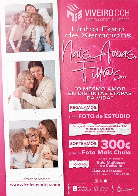“Nesta ocasión apostamos por seguir premiando a fidelidade dos nosos clientes con algo especial para celebrar nesta data, e para conmemorar o Dia da Nai organizamos a campaña Unha foto de xeracións: nais, avoas e fill@s, o mesmo amor en distintas etapas da vida. O sábado 2 de maio instalaremos un estudio fotográfico na Sala Multiusos do Concello. Realizaremos unha sesión de fotos a tódalas nais que se acheguen cós seus fillos/as ou incluso a tres xeracións xuntas, avoas, fillas e net@s. Os días posteriores poderán seleccionar e encargar a foto que mais lles guste e levala totalmente gratis. O único requisito para poder participar é entregar vales de compra de mínimo 20 euros de calquera dos negocios asociados ó CCHV. O horario do estudio fotográfico será o sábado 2 de maio de 11 a 14 e de 16:30 a 20:30 horas”, anuncia o Centro Histórico de Viveiro, que engade: “o obxectivo é atopar a mellor imaxe que capte a esencia do Día da Nai, polo que tódalas fotos serán valoradas por un xurado e a que obteña a mellor valoración será a gañadora de 300 euros en vales de compra para gastar en calquera dos negocios asociados ó CCHV. Buscamos a imaxe das mamás de antano e de hoxe, dende as máis tradicionais ás mais modernas e actuais. Distintas xeracións que amosen á cámara a complicidade de nais e fill@s. Unha actividade para realizar en compañía das nosas nais, fill@s, avoas, netos/as,… e quedarnos cun bonito recordo do Día da Nai”.