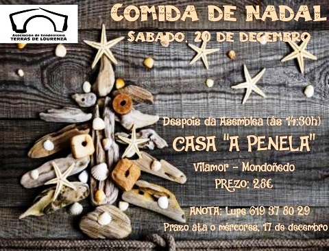 A Asociación de Sendeirismo Terras de Lourenzá celebra a súa comida de Nadal o día 20 de decembro, sábado, na Casa da Penela, en Vilamor (Mondoñedo). Será ás 14:30 horas, despois da asemblea xeral ordinaria de socios, que está fixada para as 11:30 horas en primeira convocatoria e para media hora despois en segunda, no salón de actos do Concello de Lourenzá.