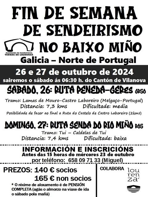 A Asociación de Sendeirismo Terras de Lourenzá organiza unha fin de semana de rutas polo Baixo Miño para os días 26 e 27 de outubro, sábado e domingo.