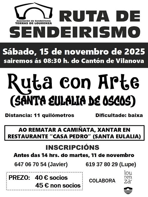 A Asociación de Sendeirismo Terras de Lourenzá organiza un percorrido pola Ruta con arte, no municipio asturiano de Santa Eulalia de Oscos, para o día 15 de novembro, sábado. A distancia a percorrer son 11 quilómetros e a dificultade é baixa. Ao rematar a camiñada os participantes xantarán nun restaurante.