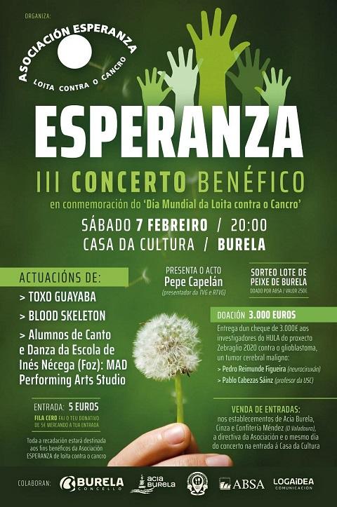 A asociación Esperanza Loita Contra o Cancro organiza un concerto benéfico na Casa da Cultura de Burela para o día 7 de febreiro, sábado, ás 20:00 horas.