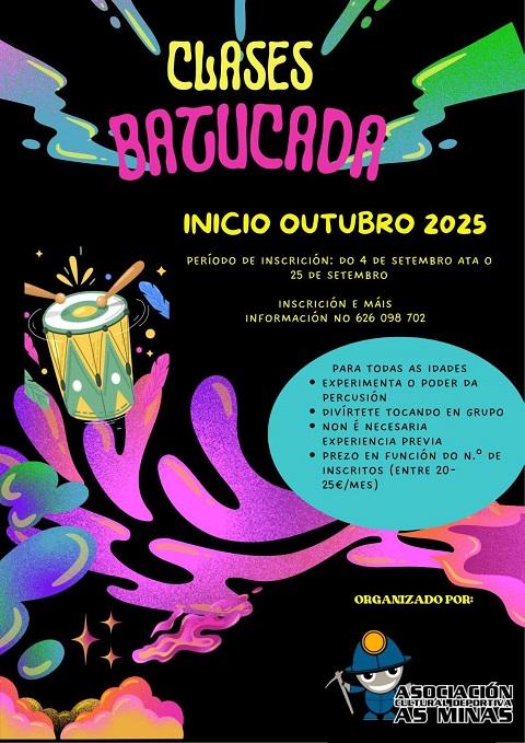A Asociación Cultural e Deportiva As Minas, da Pontenova, ofrece clases de batucada a partir de outubro. Para participar hai que inscribirse e o prazo remata este xoves, 25 de setembro.