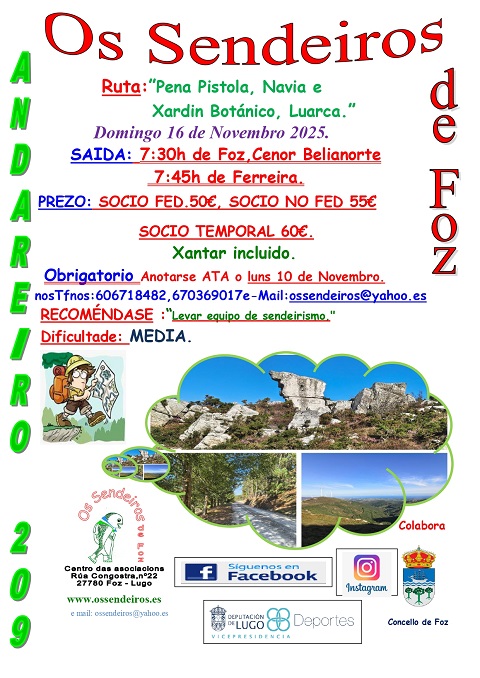 A asociación Os Sendeiros, de Foz, fará o 16 de novembro, domingo, unha ruta por Navia e Luarca, no Occidente asturiano. A saída desde Foz será ás 07:30 horas e ás 07:45 horas desde Ferreira do Valadouro.