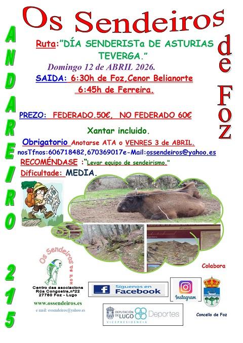 A asociación Os Sendeiros, de Foz, participará no Día Senderista de Asturias, que será o día 12 de abril, domingo, en Teverga. A saída desde Foz será ás 06:30 horas e ás 06:45 horas desde Ferreira do Valadouro.