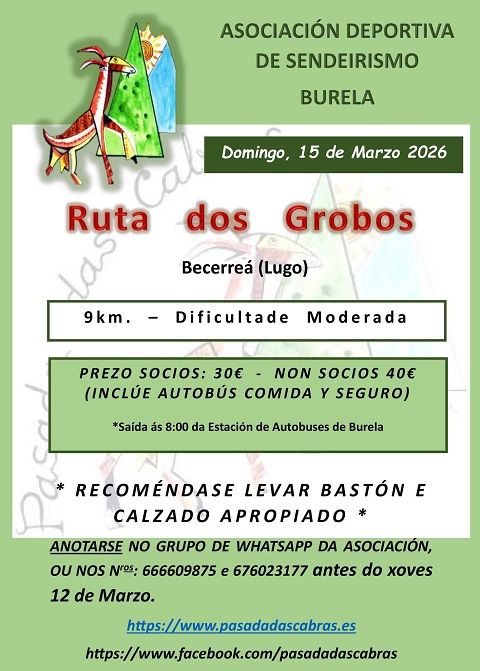 A Asociación Deportiva de Sendeirismo Pasada das Cabras, de Burela, fará a Ruta dos Grobos, no municipio lucense de Becerreá, este domingo, día 15 de marzo. O prezo é de 30 euros para os socios do colectivo organizador e de 40 euros para os que non o son. Inclúe autobús, comida e seguro. A saída será ás 08:00 horas desde a estación de autobuses de Burela.